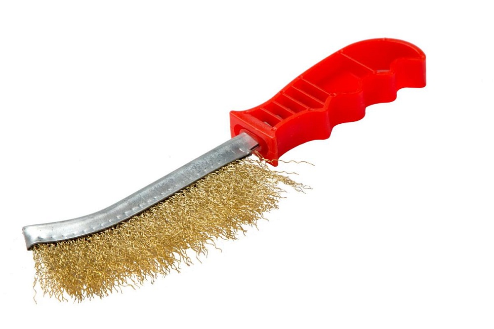 Представляет собой сочетание стальной щетины с латунным покрытием в металлическом корпусе и пластиковой рукоятки, выполненной по форме ладони. Данное изделие служит для зачистки металлических поверхностей в щадящем режиме